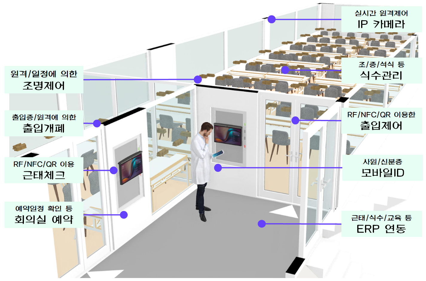 각종 출입구에 설치되어 모바일사원증과 블루투스비콘을 이용하여 출입시 게이트제어, 도어제어를 통해 출입을 통제합니다.