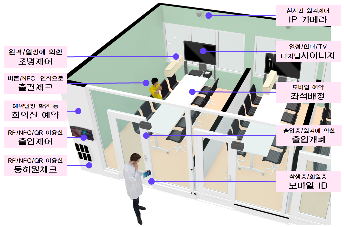 사용자의 안드로이드/애플 스마트폰용 혹은 부착형 태블릿으로 제공되어 공용공간에 대한 배정/예약등을 통해 시설의 공평한 공유를 제공합니다.