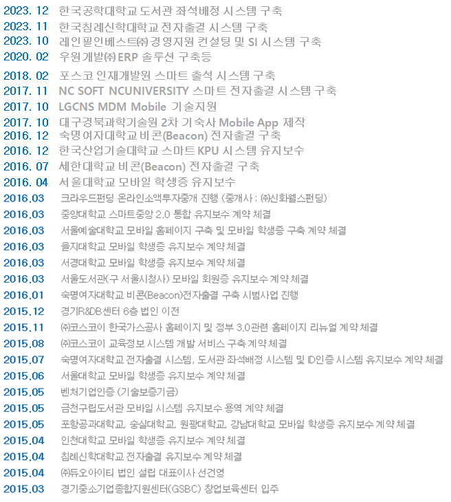 ㈜듀오아이티는 2015년 4월 1일 설립된 이래 기업 및 대학 캠퍼스의 정보화 사업 시장을 선도해 온 스마트 기기 기반 서비스 제공 전문회사로서, 축적된 기술과 경험을 기반으로 모바일 시스템 개발 및 아웃소싱 서비스를 제공하고 있습니다.